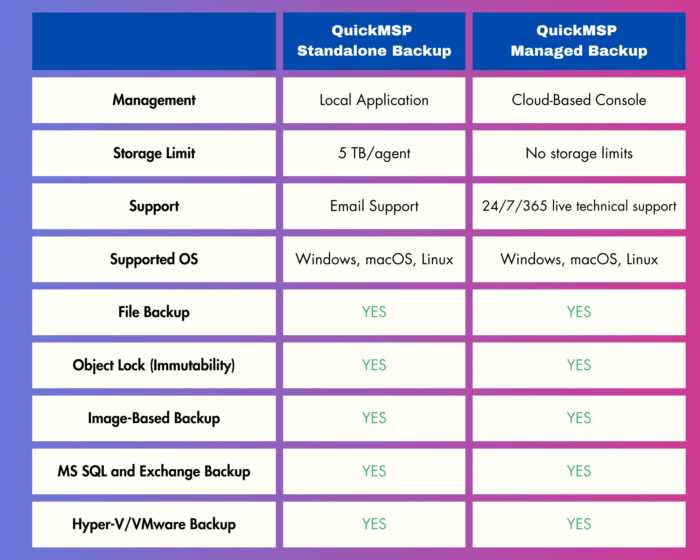 QuickMSP Backup software encompasses three feature-rich and cost-effective backup solutions that are adaptable to any IT environment. All QuickMSP products are developed in-house, guaranteeing best-in-class security, exceptional stability, and streamlined licensing and billing processes.